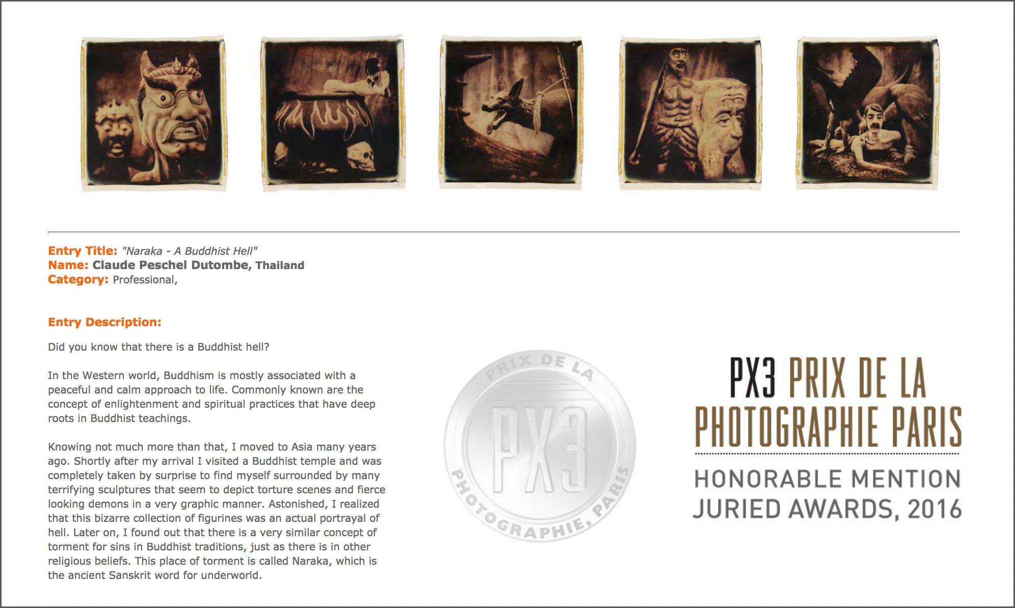 "Naraka, Buddhist Hell" has been awarded a Honorable Mention at the Prix de la Photographie Paris ( Px3 Paris Photography Prize ) 2016 in the Professional Fine Art (Other) Category.